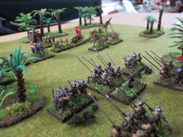 The Malayans. Archers and headhunter scouts in front. Rear: warriors, Sultan's Guard (in vests), elephants, rockets (not too many armies give you that illustrious combination!)